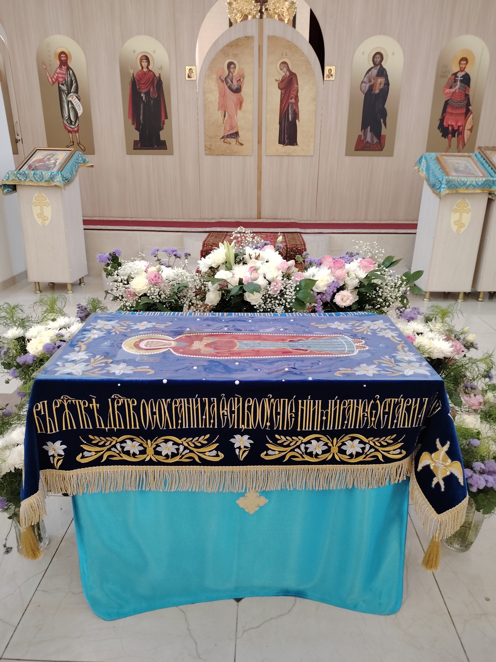 Плащаница Божией Матери, украшенная живыми цветами, стала центром молитвенного внимания. Перед ней был возжен светильник и совершено каждение.