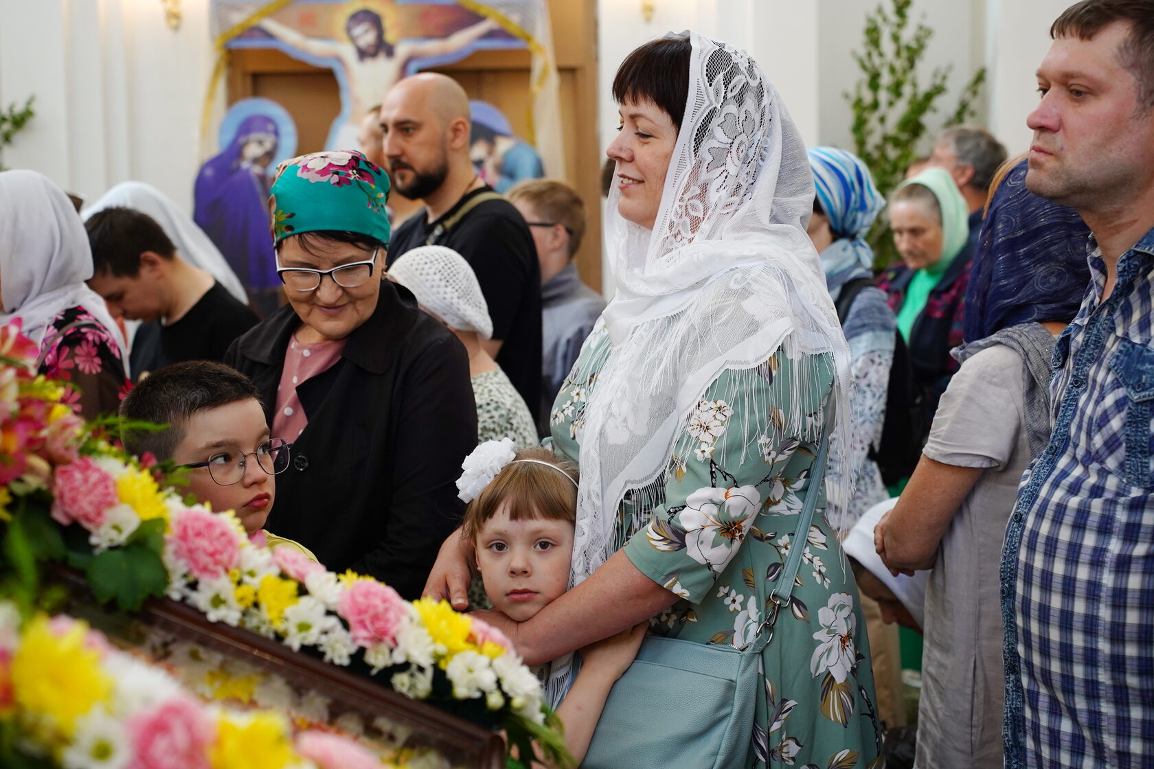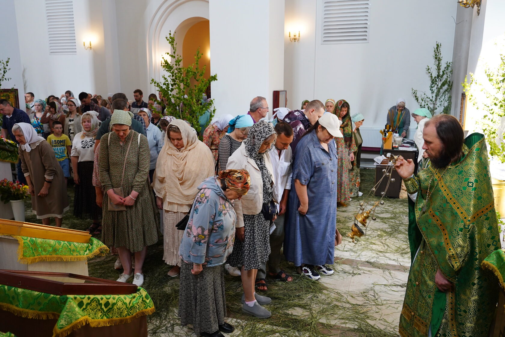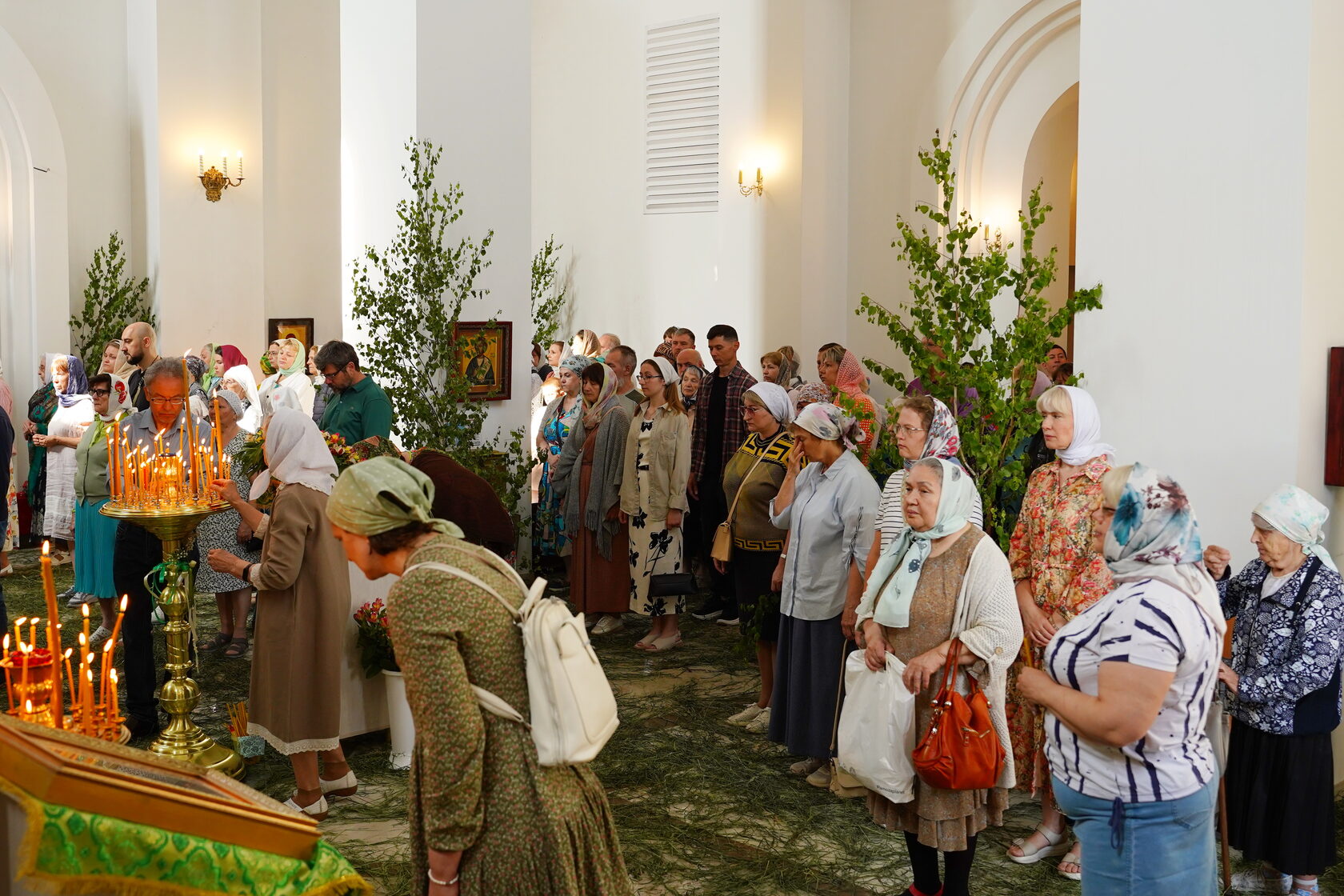 Храм, украшенный изумрудной зеленью и веточками березы, был наполнен верующими.