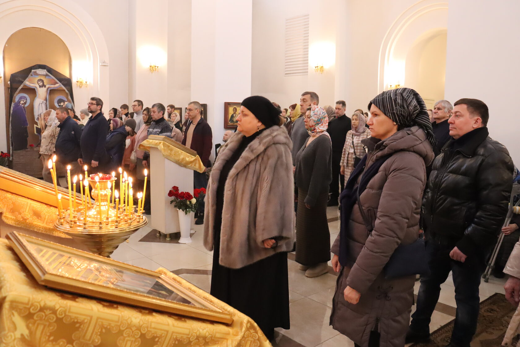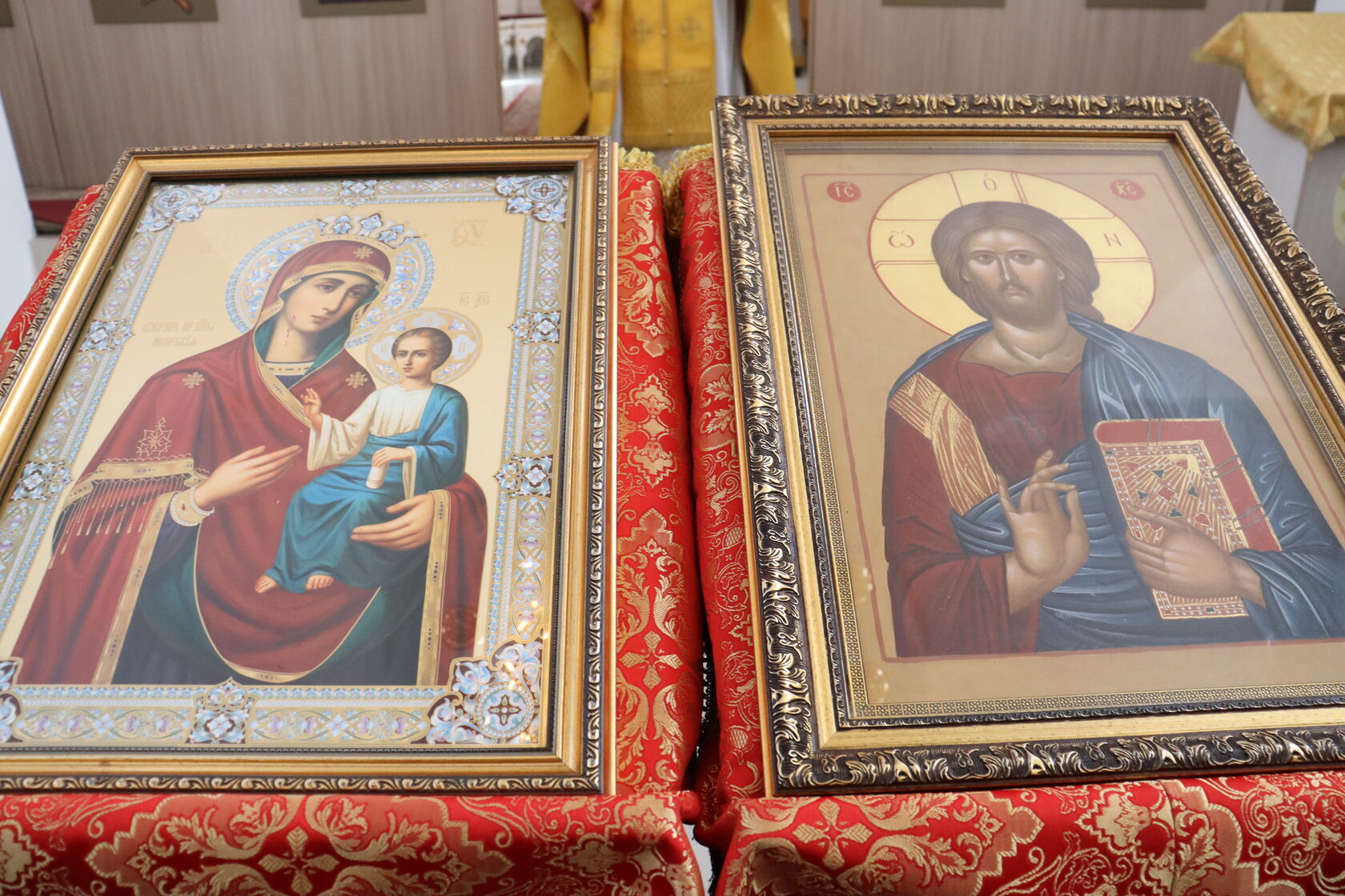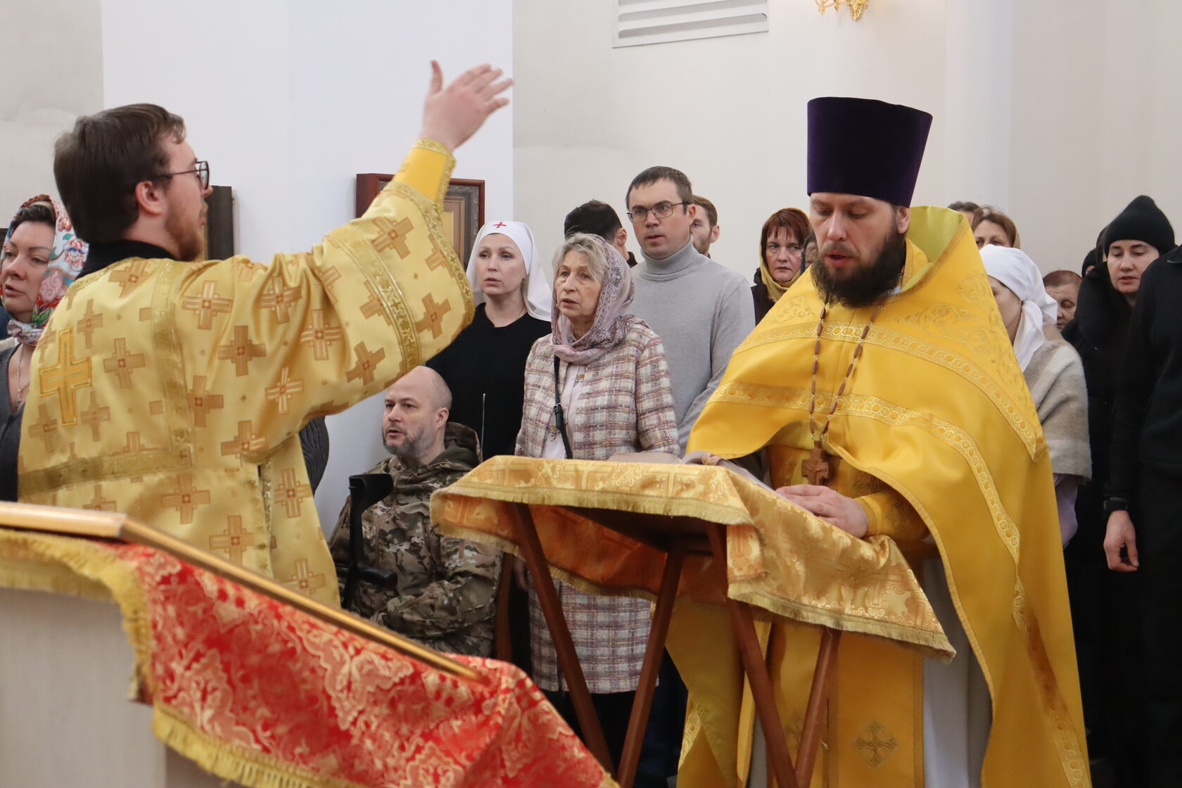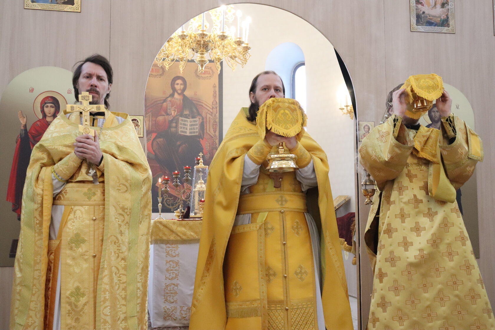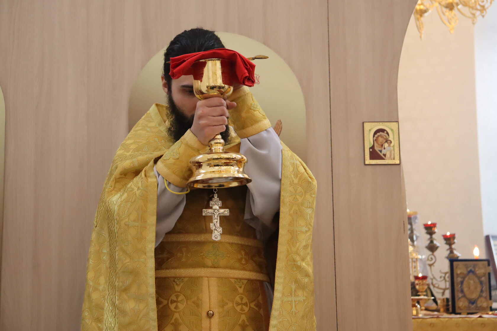 В центре храма были размещены иконы Господа и Божией Матери на красных накидках — это символ победы Седьмого Вселенского Собора над иконоборчеством. Священник подчеркнул: почитая иконы, христиане взирают на образ, но мысленно обращаются к Первообразу — Самому Господу.