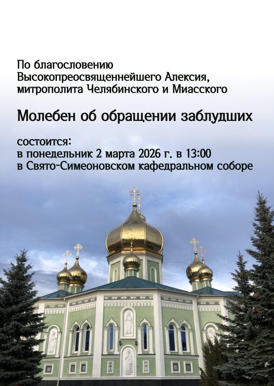 2 марта в 13-00 по благословению Высокопреосвященнейшего Алексия, митрополита Челябинского и Миасского, в Свято-Симеоновском кафедральном Соборе состоится Молебен об обращении заблудших.