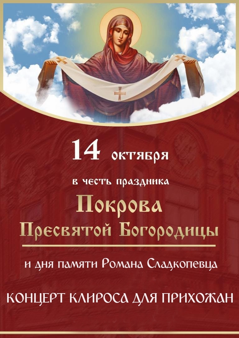 Сердечно приглашаем вас принять участие в праздничном мероприятии, которое состоится 14 октября — в великий праздник Покрова Пресвятой Богородицы.