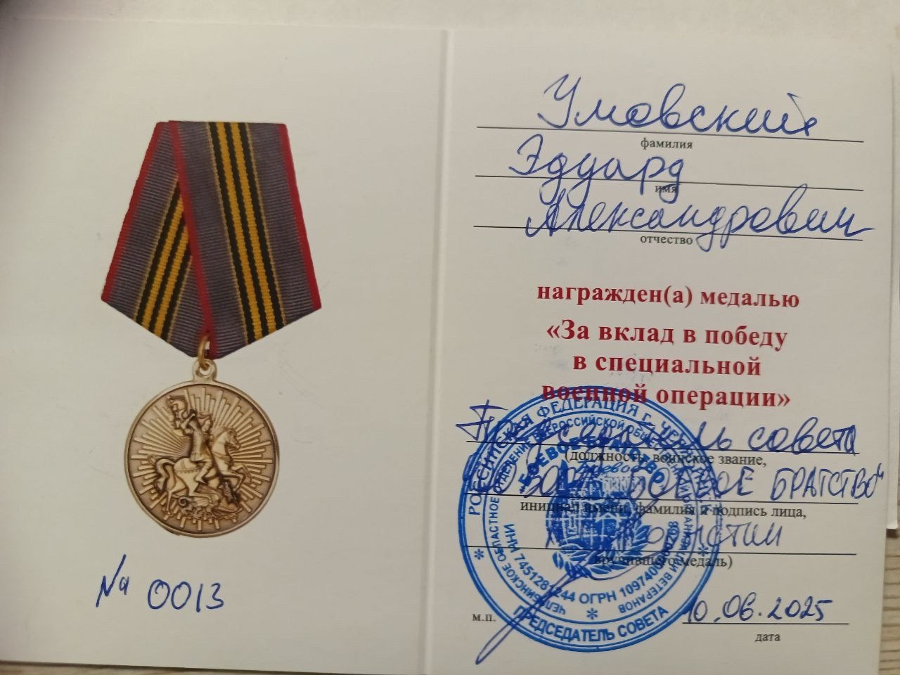 Вручение награды было запланировано на 12 июня 2025 года, однако в этот день Эдуард находился в г. Кременная, выполняя очередную гуманитарную миссию.