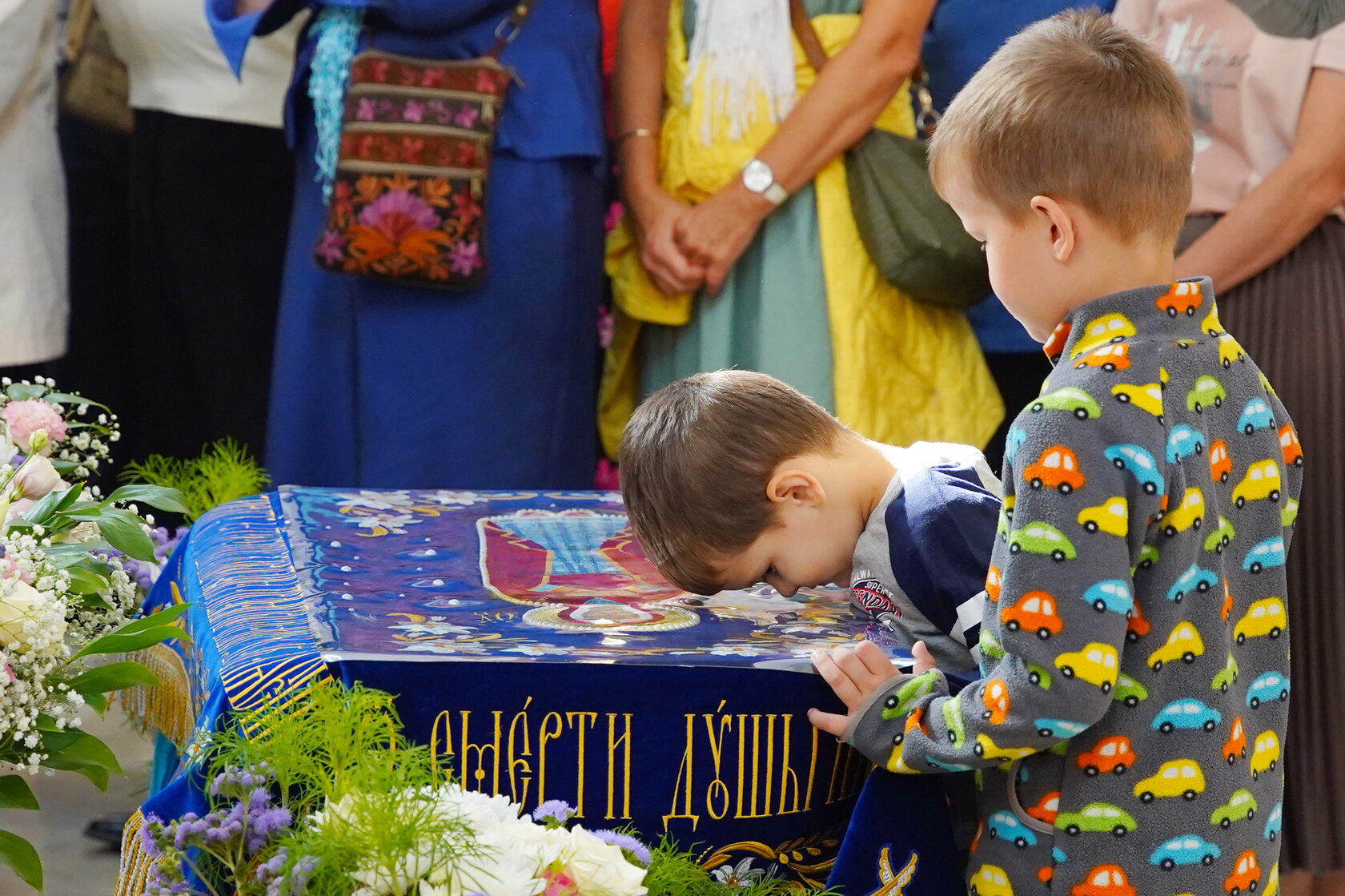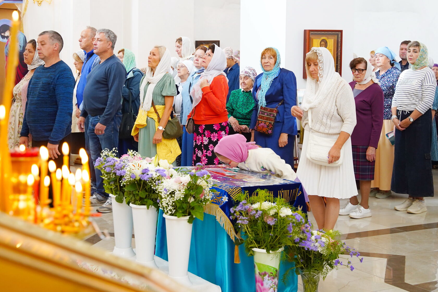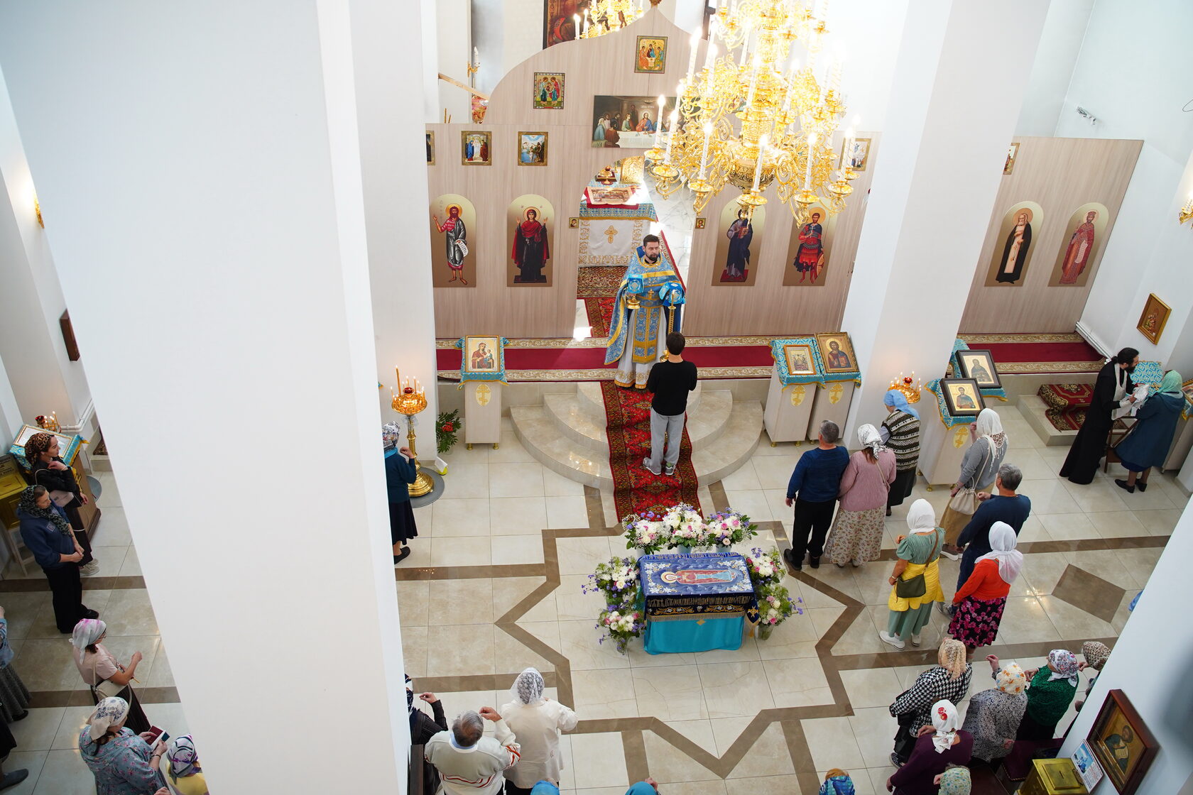Голубой цвет, традиционно символизирующий чистоту и непорочность Божией Матери, стал одним из украшений этого дня. Многие женщины, пришедшие на службу, были одеты в голубые одежды, а храм сиял праздничными голубыми убранствами, создавая особую атмосферу небесной радости и умиротворения.